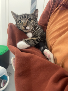 Alya was a surrender, although she originally came in very scared and skittish - she has recently grown to see the joy in humans and cuddles. She is a super affectionate girl who loves to sit for hours on your knee and cuddle up to you. She is currently not spayed, but will be upon her collection. She has grown to be so loving in what could be such a scary situation for her, and now she is looking for a new home to share that love with.